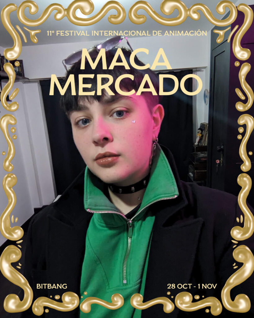 Animadora y directora de arte, Maca Mercado centra su trabajo en la animación y en la producción de videojuegos. Es fundadora del Club a 12 fps, una comunidad donde artistas se reúnen para crear, mostrar y experimentar con proyectos animados e interactivos. Su estilo se enfoca en personajes expresivos, colores potentes y una impronta lúdica que conecta con el humor y la cultura urbana. Entre sus últimos proyectos destacan los videojuegos 𝘋𝘪𝘻𝘢𝘯𝘨: 𝘛𝘩𝘳𝘰𝘶𝘨𝘩 𝘵𝘩𝘦 𝘕𝘪𝘯𝘦 𝘏𝘦𝘭𝘭𝘴 y 𝘚𝘶𝘣𝘸𝘢𝘺 𝘚𝘩𝘳𝘦𝘥𝘥𝘦𝘳, los cuales siguen en etapa de producción, donde es productora y directora de arte.